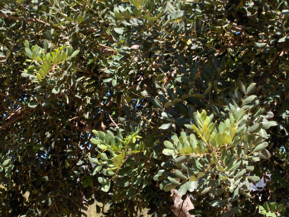 El algarrobo alcanza los 15 m de altura; es de follaje perenne. Tiene hojas pinnadas de color verde oscuro y flores pequeñas, rojas y apétalas. El fruto la algarroba es una vaina coriácea de color castaño oscuro, de 10 a 30 cm de longitud, que contiene una pulpa gomosa de sabor dulce y agradable que rodea las semillas. Las vainas son comestibles y se usan como forraje.